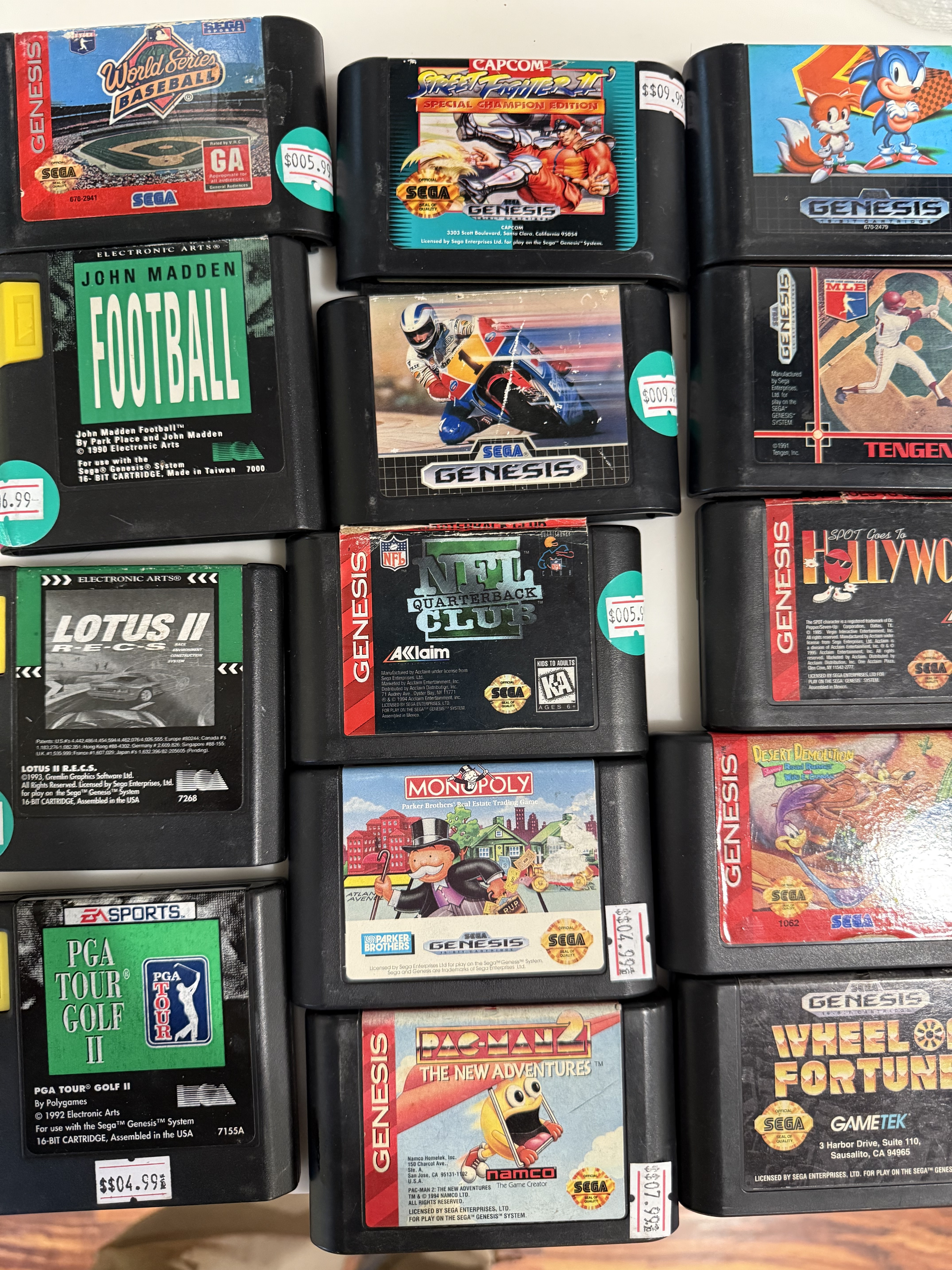 Today’s haul. Ignore the price tags on the carts. Bought this as a lot at a good Will. Street Fighter 2 special champion addition and the first Sega madden. Special place in my heart.