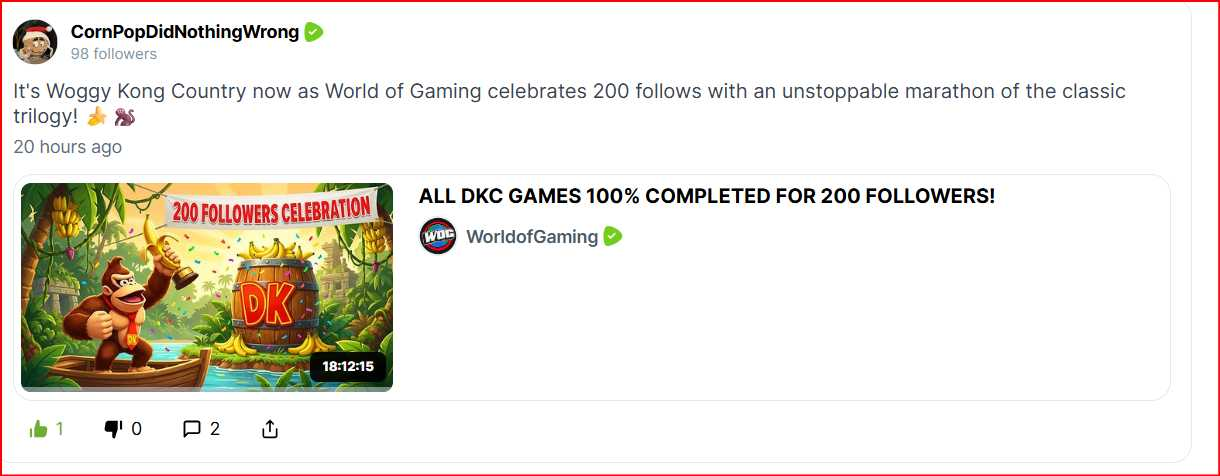 While I didn't 100% all the dkc games in one stream. My new record for streaming is 20 hours on @GamingOnRumble by myself with no breaks. I do feel accomplished for my 200 followers goal. Thanks everyone who tune in