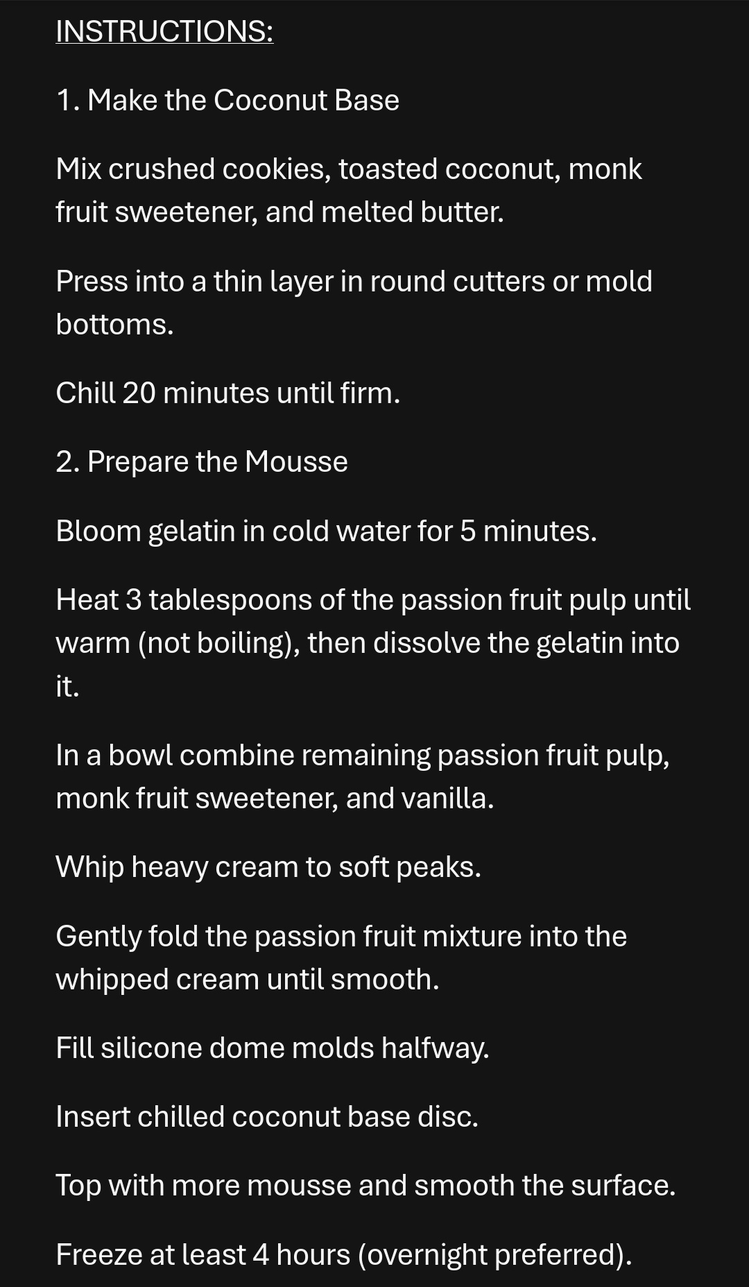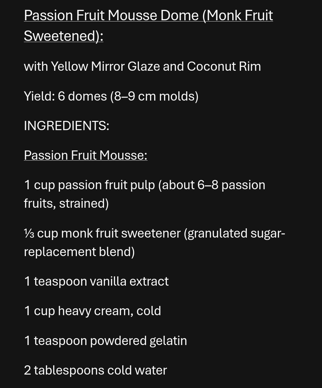 The dessert is something I learned recently, I call it “Guiño de la Bruja” (Witch’s Wink): a passion fruit mousse. Light, airy, and not overly sweet. I used monk fruit sugar as a natural substitute, though regular sugar works perfectly fine.