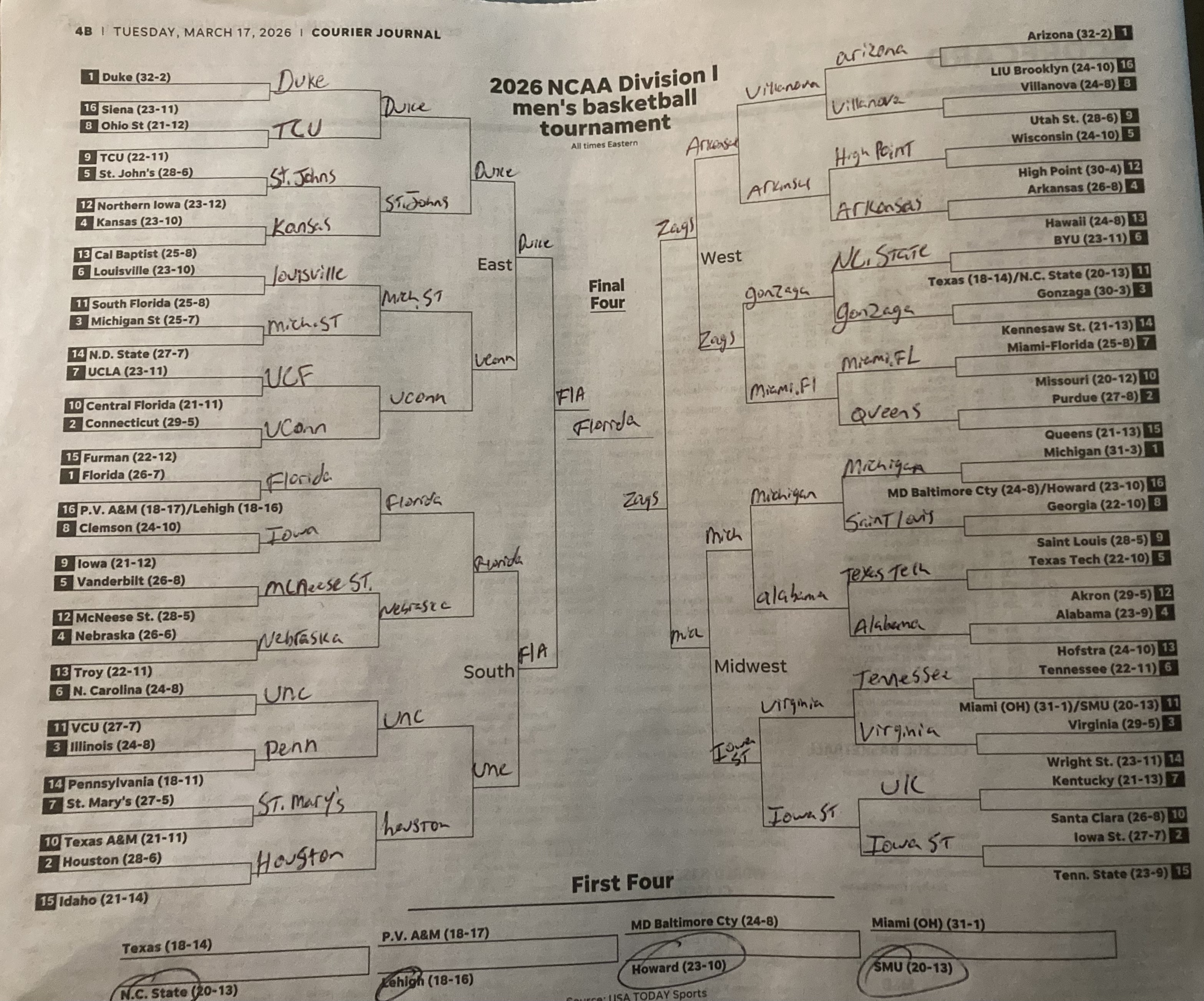 My Bracket for March Madness. My favorite team is Louisville but sadly I don’t think we’ll shock the country and win it all like in 2013. What does y’all’s Bracket look like if you filled one out?